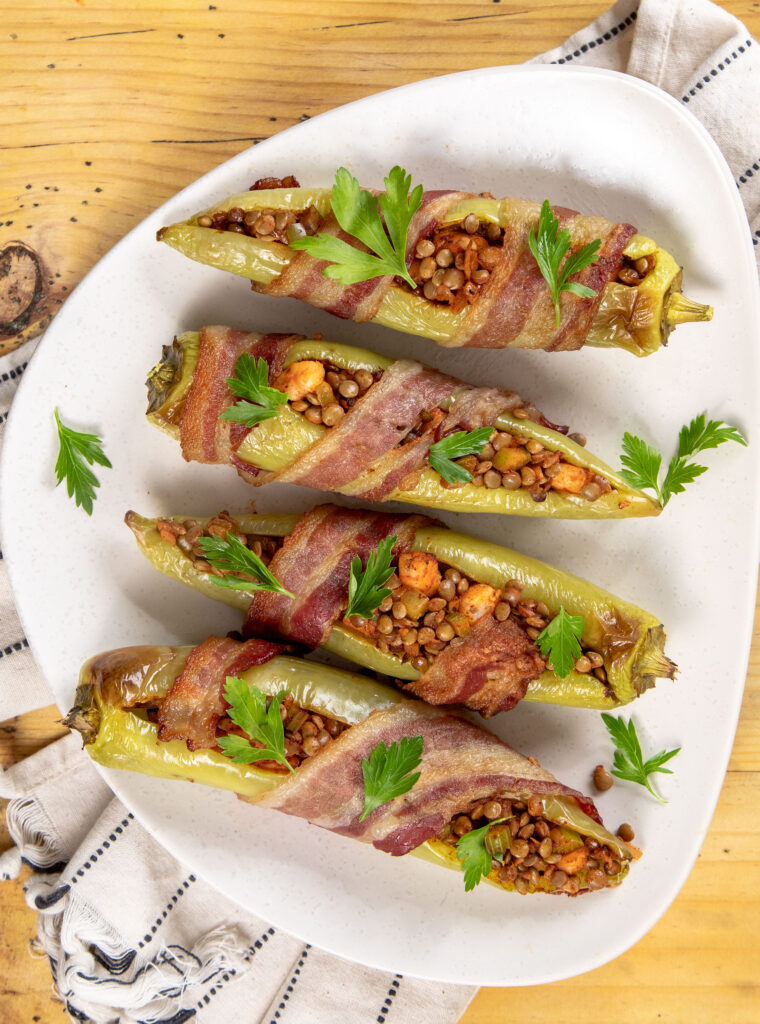 Haz un corte a los chiles a lo largo y abre. Retira las semillas y venas y rellena con la mezcla de lentejas. Envuelve los chiles con una rebanada de tocino cada uno y coloca en una charola para horno. Hornea durante 15 minutos o hasta que el tocino esté dorado y los chiles suaves. Comparte y disfruta.