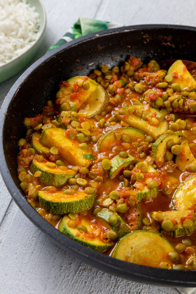 Derrite la mantequilla en un sartén amplio y añade la cebolla. Cocina hasta que esté transparente, agrega las calabacitas y permite que doren. Añade los chícharos secos, caldo, leche de coco y tomates triturados. Cocina a fuego bajo durante 30 minutos o hasta que la salsa espese y los chícharos estén suaves. Sirve sobre arroz jazmín y decora con cilantro y almendras tostadas.